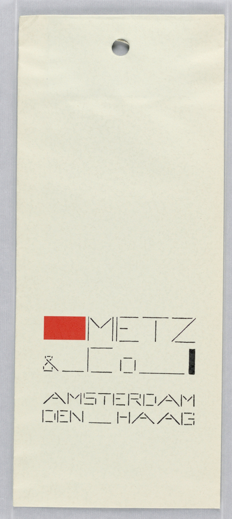 Shopping Bag, Metz & Co. Shopping Bag; Netherlands; screenprint in black, red ink on white wove paper, string; 31 x 13 x 0.6 cm (12 3/16 x 5 1/8 x 1/4 in.), laid flat; Gift of June Braun and Robert Leibowits; 1994-63-4