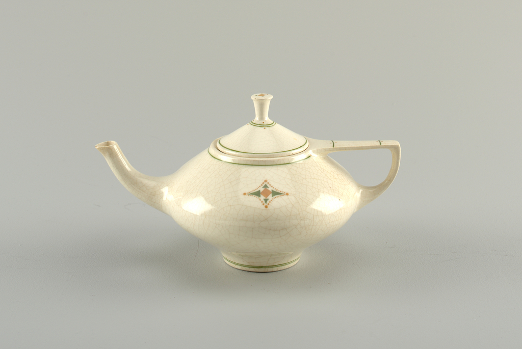 This is a teapot. It was designed by Christian Johannes van der Hoef and manufactured by Amphora Factory. It is dated ca. 1908 and we acquired it in 1994. Its medium is earthenware. It is a part of the Product Design and Decorative Arts department.