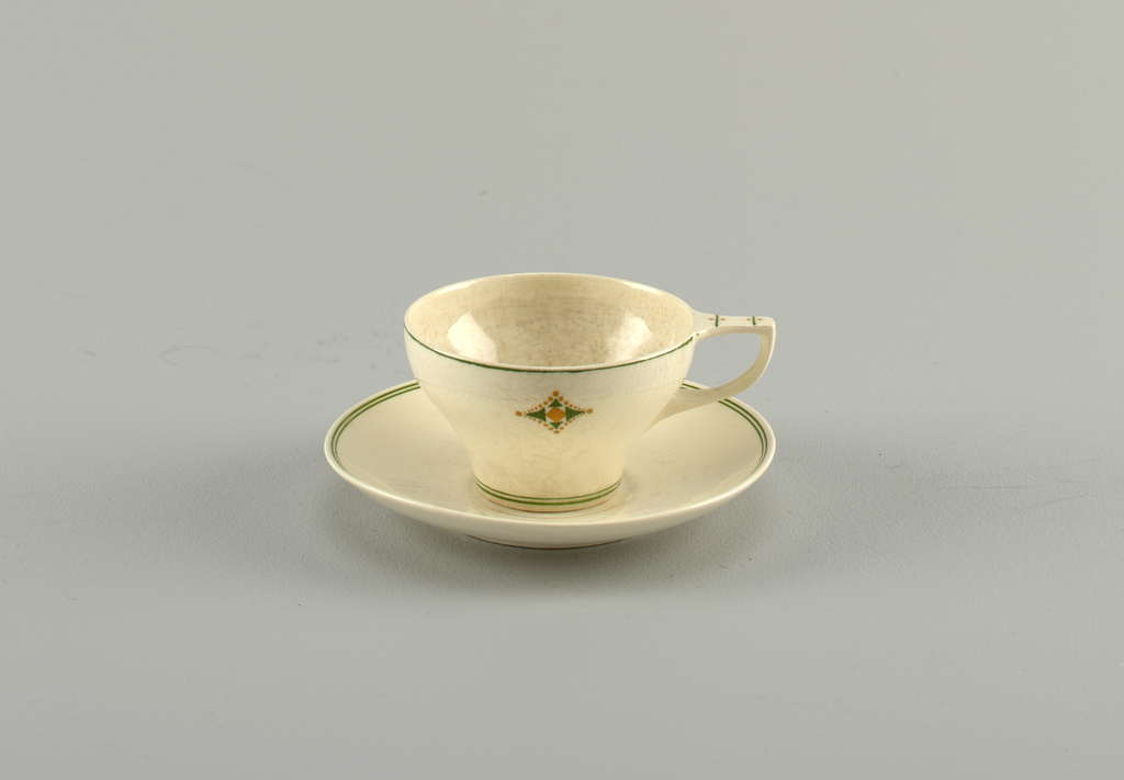 This is a cup and saucer. It was designed by Christian Johannes van der Hoef and manufactured by Amphora Factory. It is dated ca. 1908 and we acquired it in 1994. Its medium is earthenware. It is a part of the Product Design and Decorative Arts department.