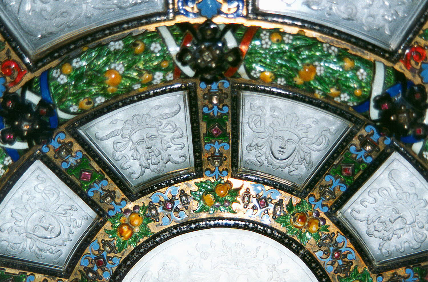 Dish (Austria); Attributed to J. & L. Lobmeyr (Austria), Hermann Ratzerdorfer; glass, silver, gold, enamel, gem stones; 56.5 cm diameter (22 1/4 in.); Gift of the Houston Museum of Natural Science; 1995-105-1-a/d