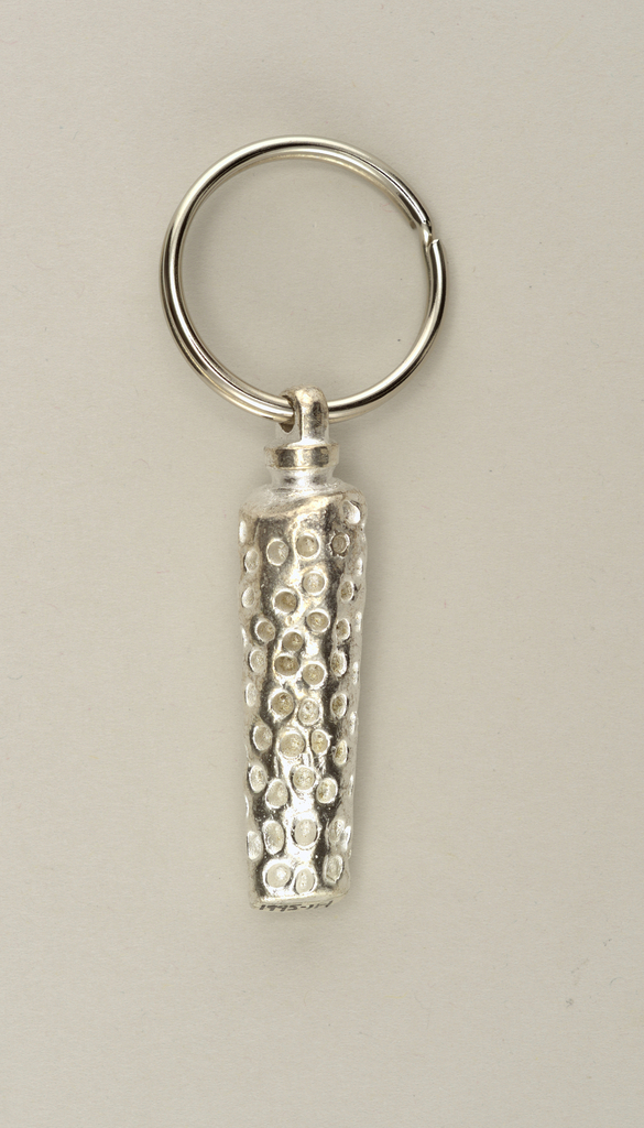 Pendant (USA); silver-plated metal, possibly aluminum; Overall: 7.6 x 2.7 x 1 cm (3 x 1 1/16 x 3/8 in.); Gift of Anonymous Donor; 1995-11-1-a,b