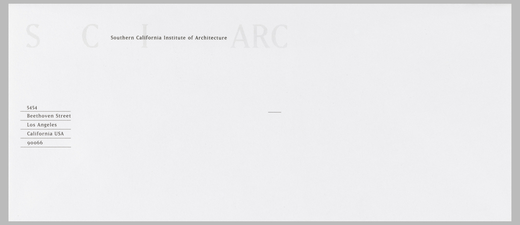 Envelope, SCI-Arc (Southern California Institute of Architecture); Designed by April Greiman (American, b. 1948); USA; offset lithograph on white paper; 10.5 x 24.1 cm (4 1/8 x 9 1/2 in.); Gift of April Greiman; 1995-167-13