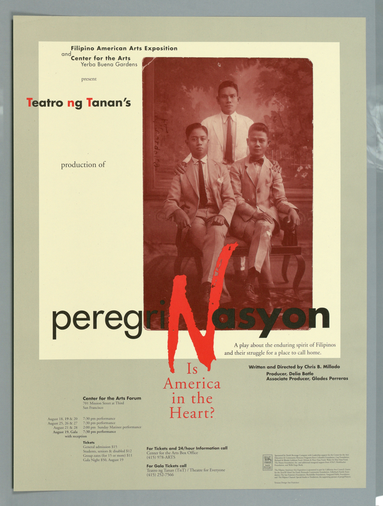 Printed in plate, in black, bottom right: "Written and Directed by Chris B. Millado/ Producer, Delia Batle/ Associate producer, Glades Reneras". Imprinted in black, center: "Is (in hot pink)/ America/ in the/ Heart?." Imprinted in black, left: "Center for the Arts Forum/ 701 Mission street at Thud/ San Francisco/ August 18,19,& 20 7:30 pm performance...Tickets/ General admission $15..." Imprinted in black, bottom center: "For Tickets.../Center for the Arts Box Office/ (415) 978 Arts/ For Gala..../ Teatre ng Tanan (TnT)/Theatre for Everyone/ (415_252-7566". Imprinted lower right corner: Nestlé's Bervage logo and "Sponsored by Nestlé Company with leadership support for the Center for the Arts'/ Education & Community Resource Programs from Columbia Foundation, Gap Foundation, Richard & Rhoda Goldman Fund...Special thanks to Nordstorm, the supporting sponsor of peregriNayson."