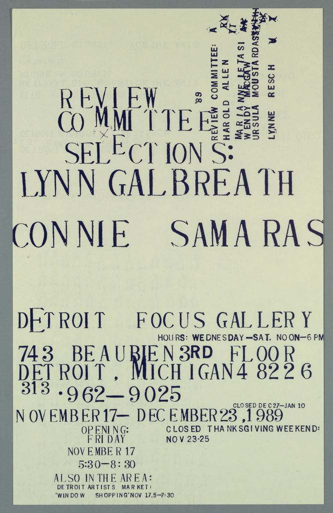 Recto: Imprinted in blue across upper half of sheet: REVIEW/ COMMITTEE/ SELECTIONS:/ LYNN GALBREATH/ CONNIE SAMARAS; upper right quadrant, upwards, sideways: '89/ REVIEW COMMITEE:/ hAR OLD ALLEN/ MAR I A A NNE IETASI/ W ENDY MACGAW/ URSULA MOUSTARDAS/ LYNNE RESCH; across lower sheet: DETROIT FOCUS GALLERY/ HOURS: WEDNESDAY --SAT. NOON- 6PM/ 743 BEAUBIEN 3RD FLOOR/ DETROIT , MICHIGAN4 8226/ 313 962 -- 9025/ CLOSED DEC27 -- JAN10/ NOVEMBER17-- DECEMBER23, 1989/ CLOSED THANKSGIVING WEEKEND:/ NOV 23-25; across lower left quadrant: OPENING:/ FRIDAY/ NOVEMBER 17/ 5:30-- 8:30/ ALSO IN THE AREA:/ DETROIT ARTISTS MARKET:/ "WINDOW SHOPPING"NOV 17,5--7:30 Verso: Across lower left quadrant: DETROIT FOCUS GALLERY/ 743 BEAUBIEN 3RD FLOOR/ DETROIT MICHIGAN 48226/ WITH SUPPORT FROM THE/ NATIONAL ENDOWMENT FOR THE ARTS/ MICHIGAN COUNCIL/ FOR THE ARTS/ DETROIT COUNCIL FOR THE ARTS; lower sheet, center, running upward, sideways: ACROSS FROM/ THE/ RICKTOWN STATION; across lower right quadrant: NON-- PROFIT ORG./ BULKRATE/ U.S.POSTAGE/ PAID/ DETROIT MICHIGAN/ PERMIT/ NUMBER 2960