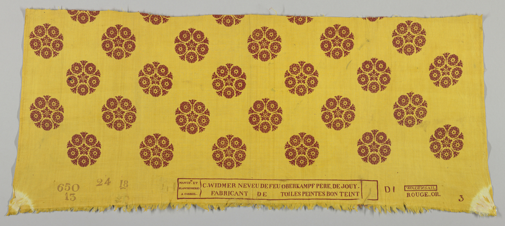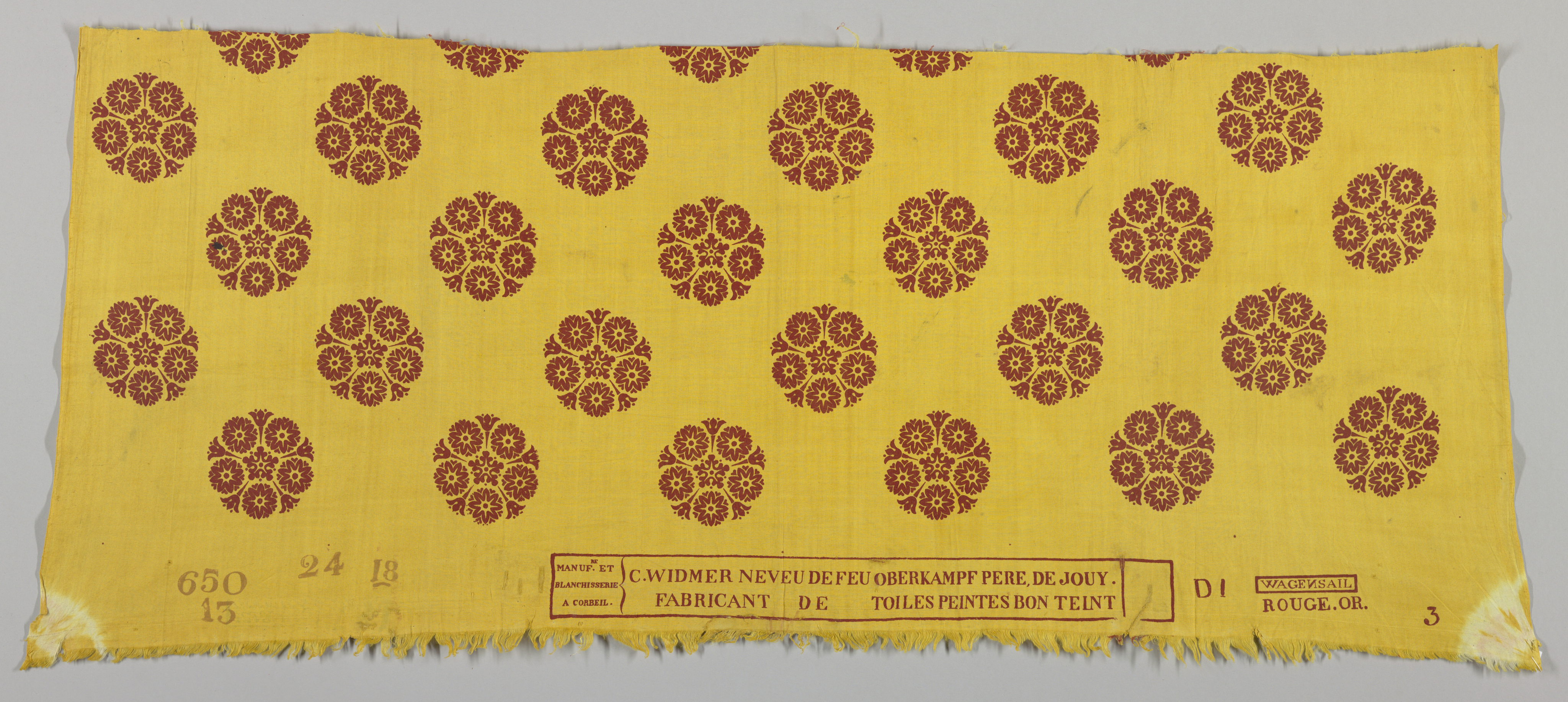 "C.WIDMER NEVEU DE FEU OBERKAMPF, DE JOUY. FABRICANT DE TOILES PEINTES BON TEINT" and at left "MANUF.re ET BLANCHISSERIE A CORBEIL." in red within compartments in the same red frame. "D1", "3", "WAGENSAIL" (backward slant to the 'N') within frame, "ROUGE.OR" all in red. In lighter red "650", "13", "24", AND "18". There is indication (red mark on the fringe) that at one time there had been another mark on the piece.