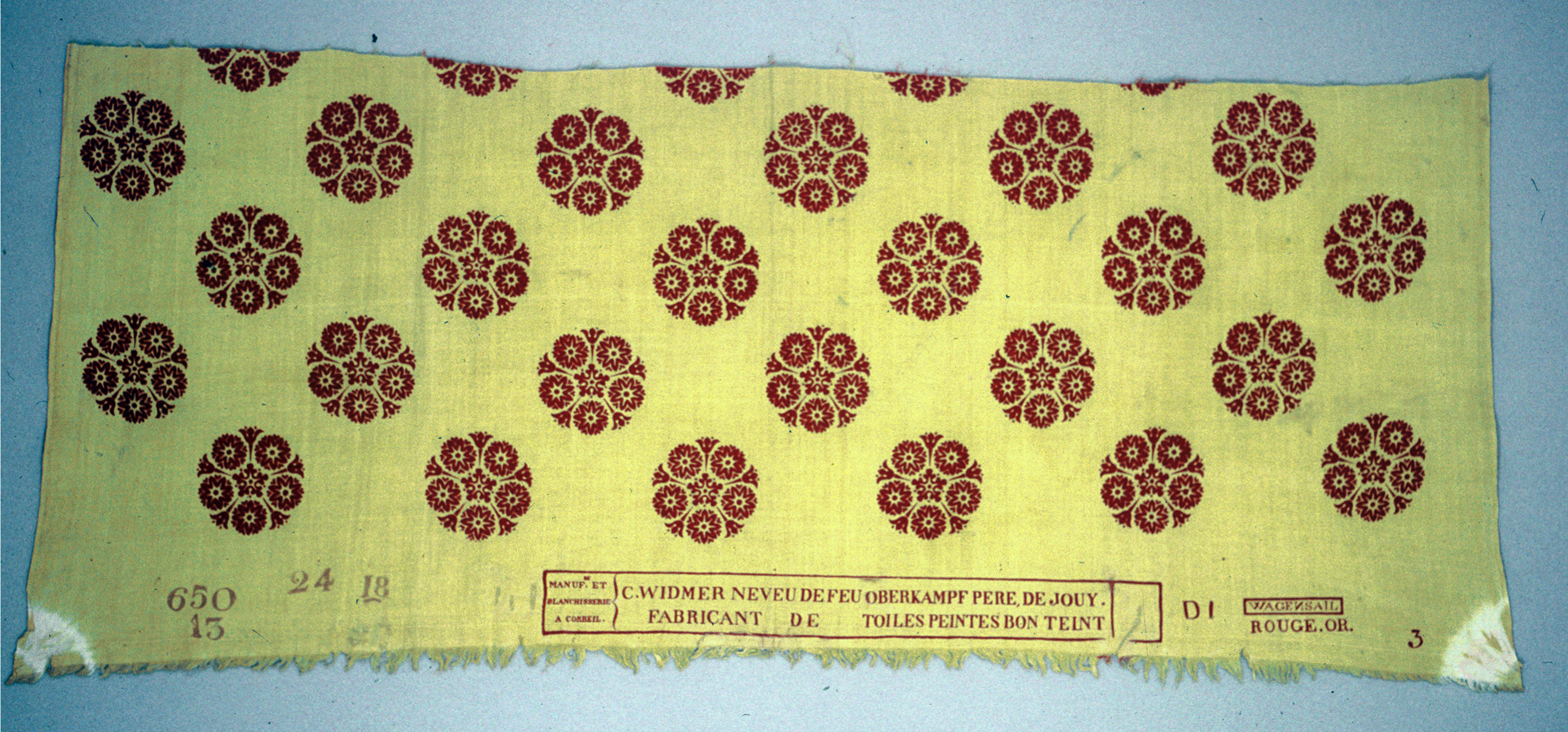 "C.WIDMER NEVEU DE FEU OBERKAMPF, DE JOUY. FABRICANT DE TOILES PEINTES BON TEINT" and at left "MANUF.re ET BLANCHISSERIE A CORBEIL." in red within compartments in the same red frame. "D1", "3", "WAGENSAIL" (backward slant to the 'N') within frame, "ROUGE.OR" all in red. In lighter red "650", "13", "24", AND "18". There is indication (red mark on the fringe) that at one time there had been another mark on the piece.