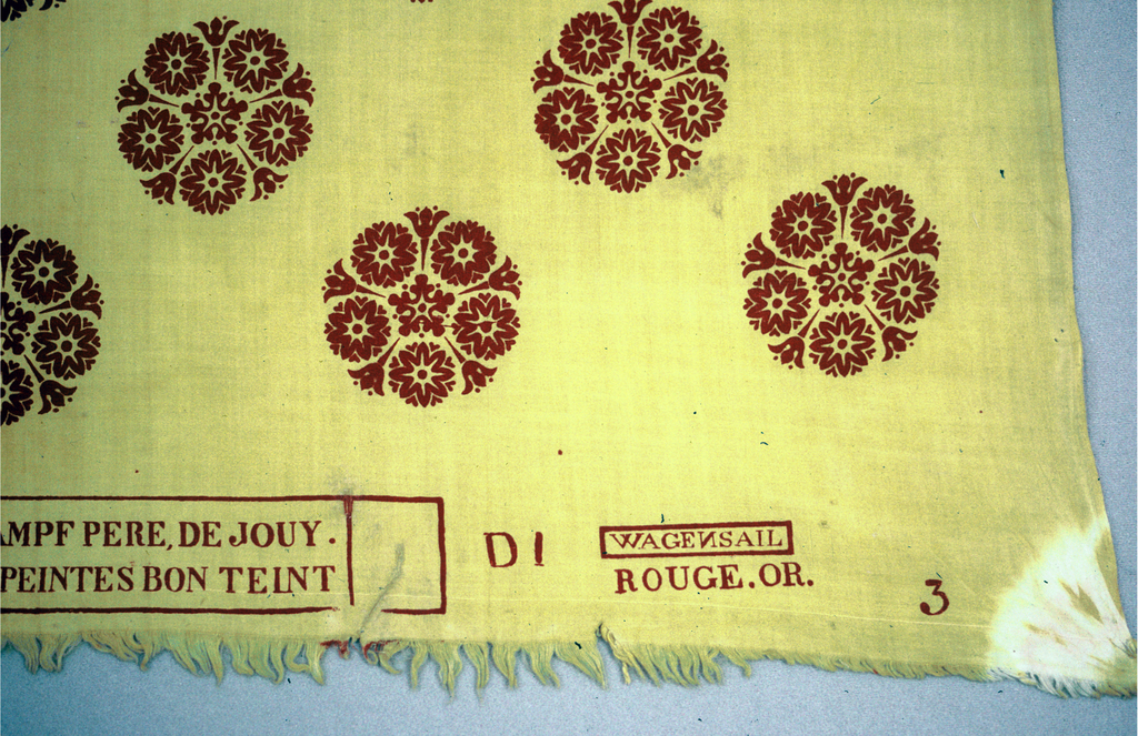"C.WIDMER NEVEU DE FEU OBERKAMPF, DE JOUY. FABRICANT DE TOILES PEINTES BON TEINT" and at left "MANUF.re ET BLANCHISSERIE A CORBEIL." in red within compartments in the same red frame. "D1", "3", "WAGENSAIL" (backward slant to the 'N') within frame, "ROUGE.OR" all in red. In lighter red "650", "13", "24", AND "18". There is indication (red mark on the fringe) that at one time there had been another mark on the piece.