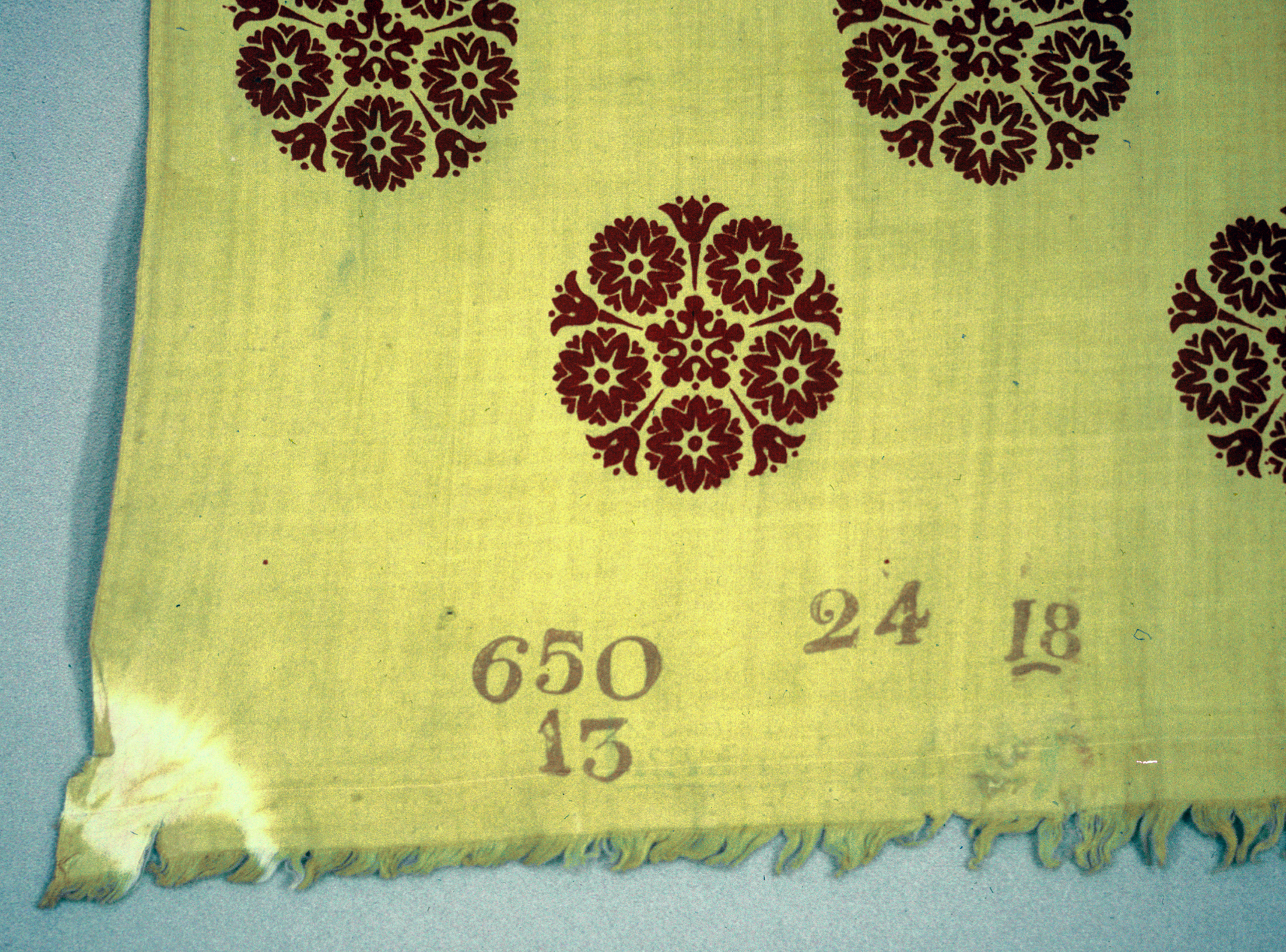 This is a Textile. It was made by C. Widmer. It is dated 1820 and we acquired it in 1996. Its medium is cotton and its technique is block printed in red on a plain weave foundation that had been dyed gold. a mark where the fabric was secured from the gold dye bath is at both of the lower corners. woven with one band of heavier weft at the bottom of the fabric. It is a part of the Textiles department.