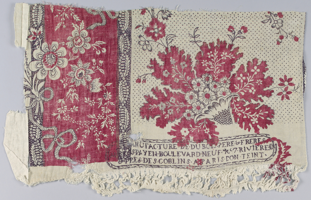 This is a Fragments. It was made by DuBois Pere et Freres. It is dated ca. 1785 and we acquired it in 1995. Its medium is cotton and its technique is printed by woodblock on plain weave foundation. It is a part of the Textiles department.