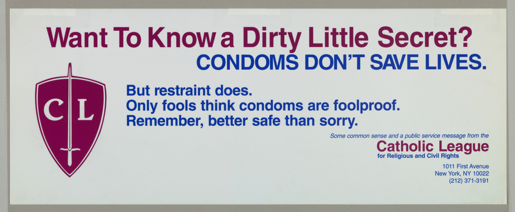 Poster, Want to Know a Dirty Little Secret? Condoms Don't Save Lives; Published by Catholic League for Religious and Civil Rights; USA; screenprint on paper on plastic; 11 x 27.9 cm (4 5/16 x 11 in.); Gift of the Catholic League for Religious and Civil Rights; 1995-64-1
