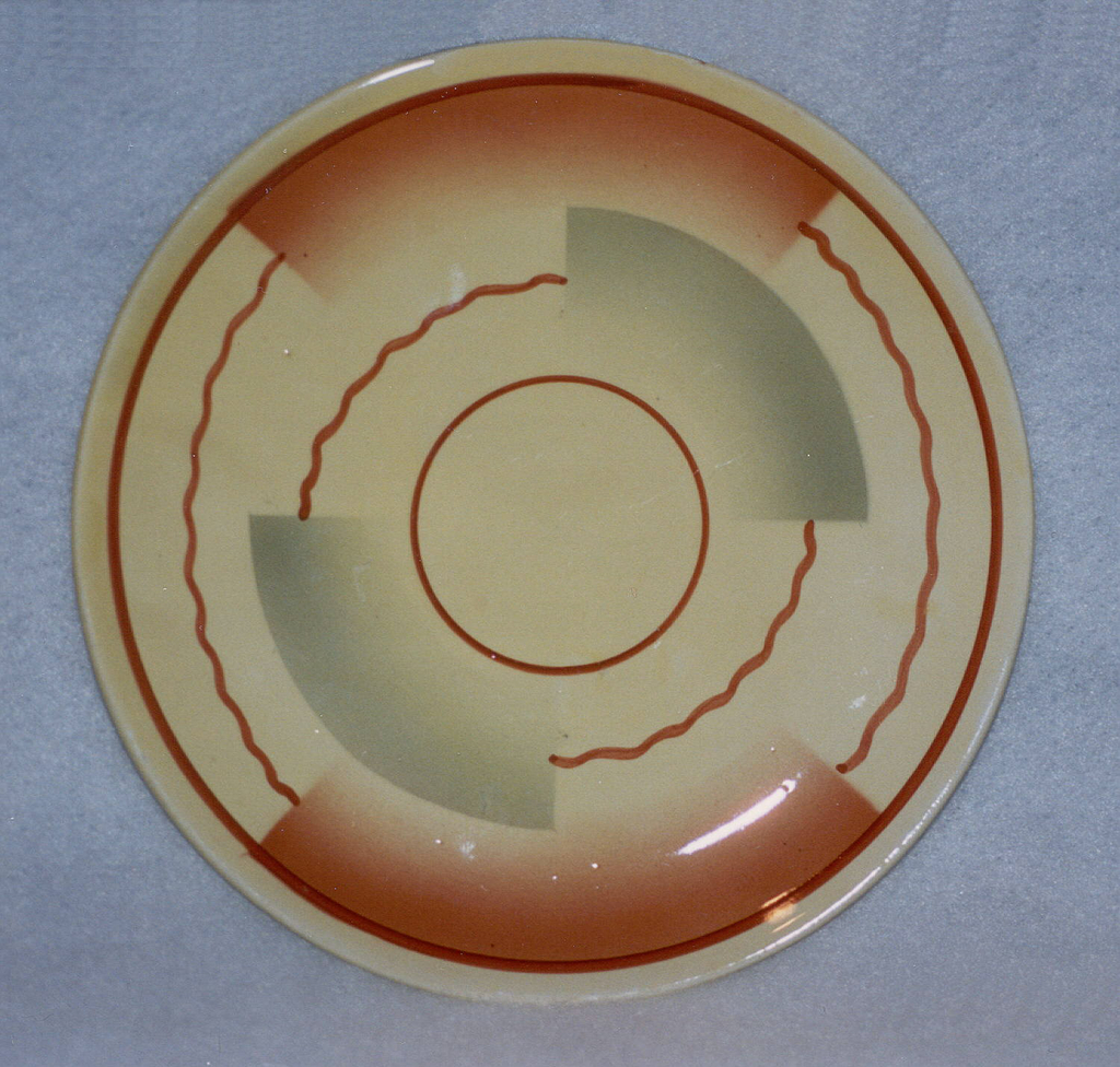 This is a plate. It was designed by Eva Zeisel and manufactured by Schramberger Majolikafabrik. It is dated ca. 1930 and we acquired it in 1996. Its medium is earthenware. It is a part of the Product Design and Decorative Arts department.