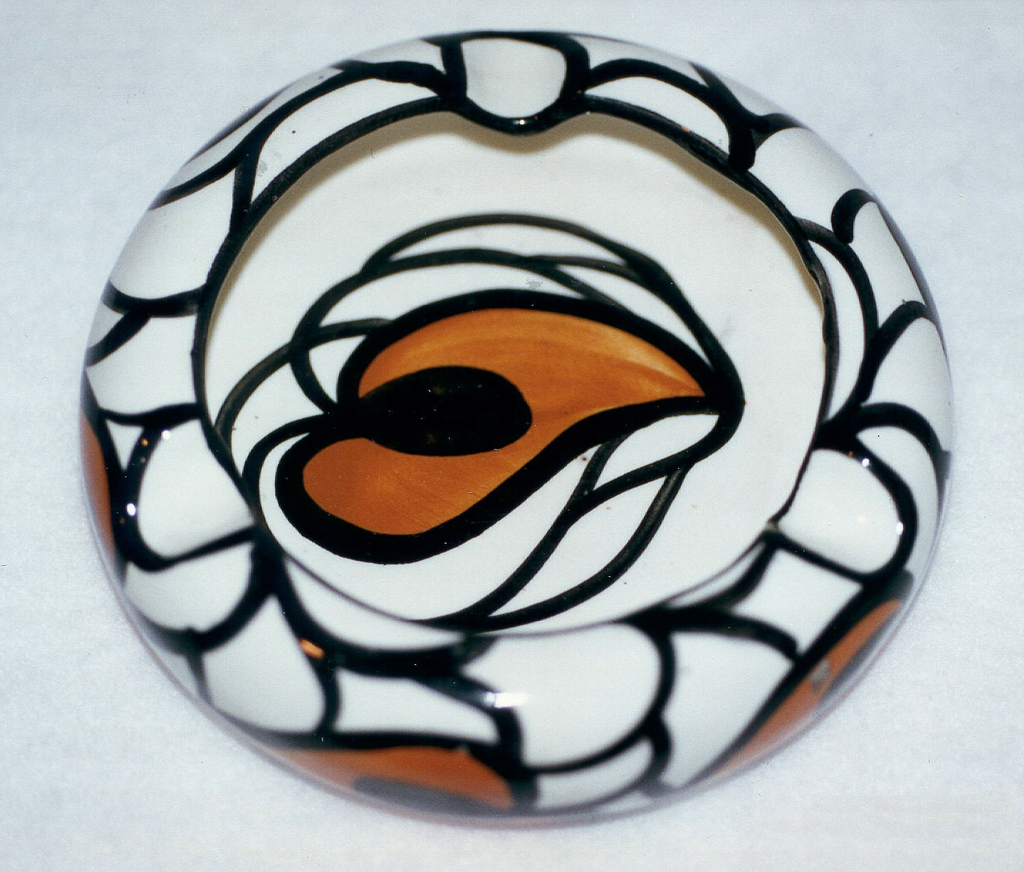 This is a ashtray. It was made by Schramberger Majolikafabrik. It is dated 1920–40 and we acquired it in 1996. Its medium is glazed earthenware. It is a part of the Product Design and Decorative Arts department.