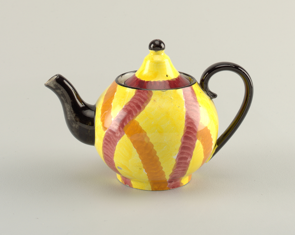 This is a teapot. It was manufactured by Schramberger Majolikafabrik. It is dated 1920–40 and we acquired it in 1996. Its medium is glazed earthenware. It is a part of the Product Design and Decorative Arts department.