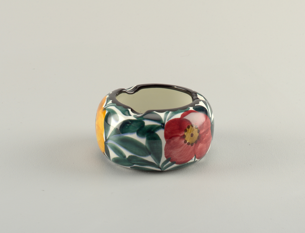 This is a ashtray. It was manufactured by Schramberger Majolikafabrik. It is dated 1920–40 and we acquired it in 1996. Its medium is glazed earthenware. It is a part of the Product Design and Decorative Arts department.