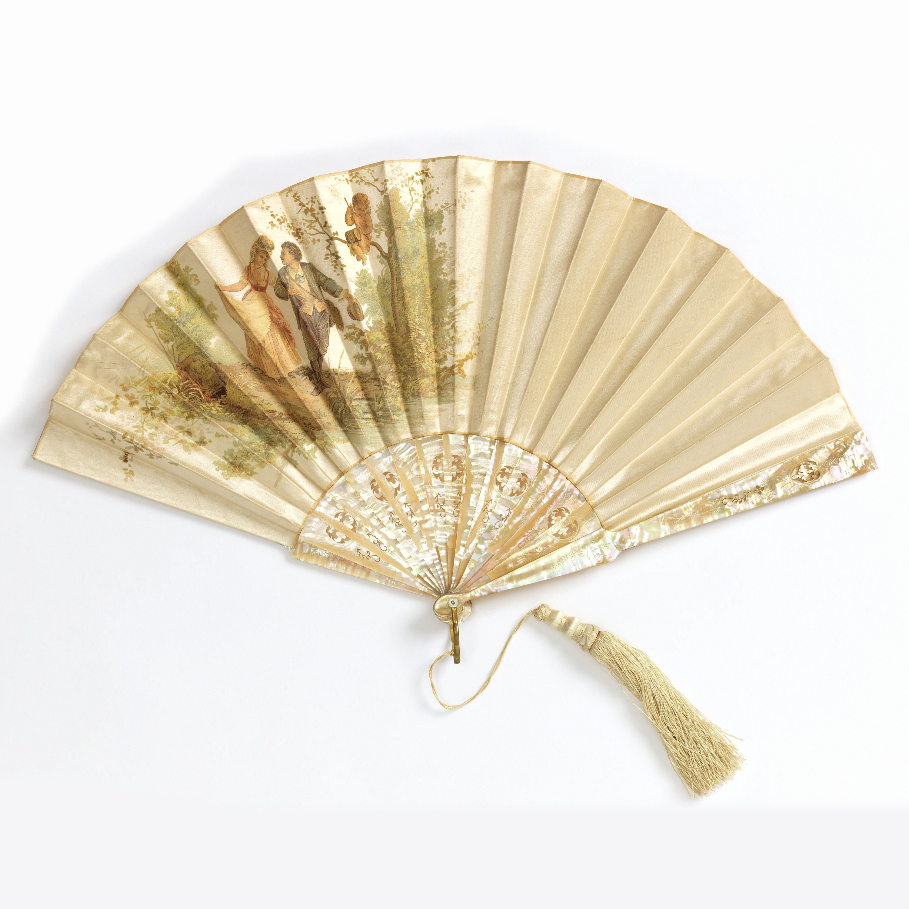 This is a Pleated fan. It was designed by A. Lauronce and created by A. Lauronce. It is dated ca. 1875 and we acquired it in 1996. Its medium is chromolithograph on silk leaf backed with stiffened cotton, drilled and carved mother-of-pearl sticks, metal bail, silk tassel, mother-of-pearl washer at the rivet. It is a part of the Textiles department.