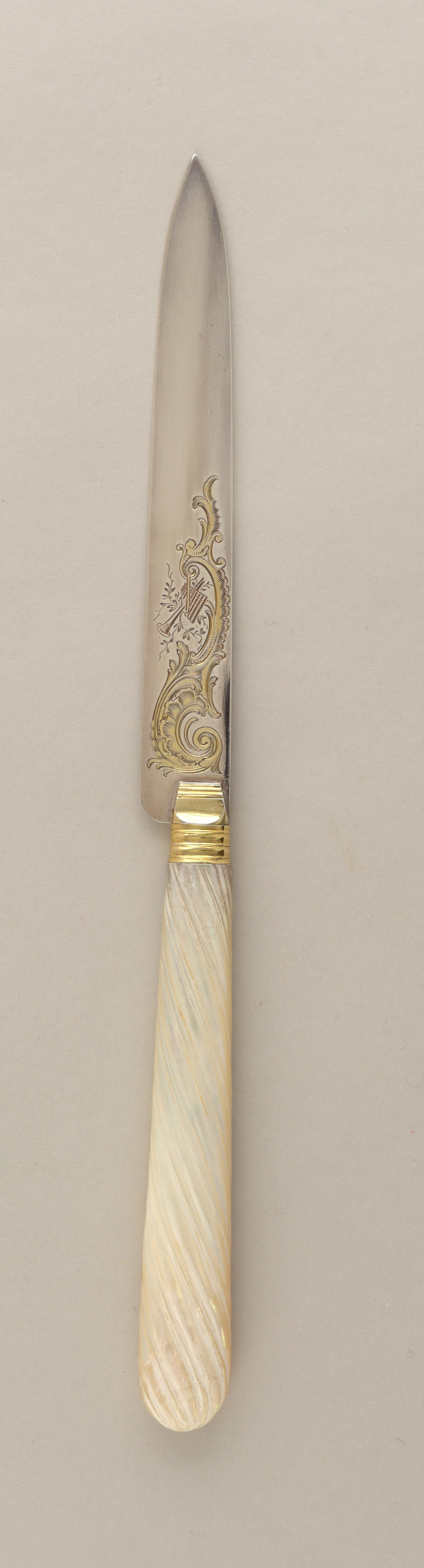 Fruit Knife with Mother-of-Pearl Handle Knife; Designed by F. Nicoud (French, active 1890); France; steel, gold plated, silver, mother of pearl; L x W x D: 20 × 1 × 0.8 cm (7 7/8 × 3/8 × 5/16 in.); Museum purchase from Smithsonian Institution Collections Acquisition Program, Decorative Arts Association Acquisition, and Sarah Cooper-Hewitt Funds; 1996-56-71