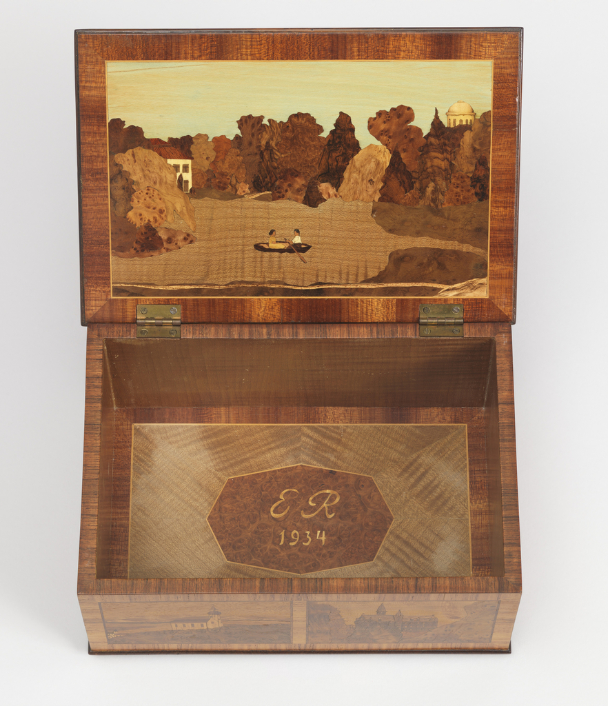 On interior, floor of box: E R (in rounded script) / 1934 inlaid in varous woods.