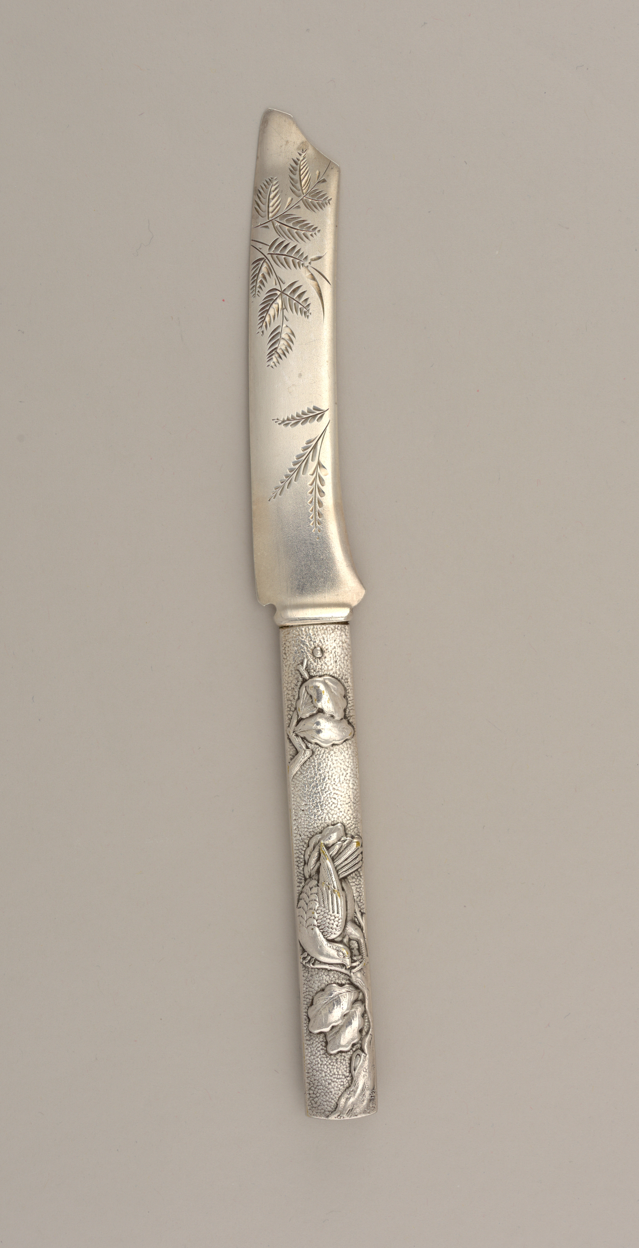 On base of blade, stamped: [1] Lion passant, anchor, gothic G (maker's mark for Gorham) [2] STERLING [3] 5