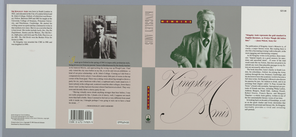 Book Cover, Memoirs; Designed by Carin Goldberg (American, b. 1953); Written by Kingsley Amis (English, 1922 - 1995); Published by Summit Books; USA; lithograph on paper; 24.1 × 54.8 cm (9 1/2 × 21 9/16 in.); Gift of Steven Heller; 1996-74-105
