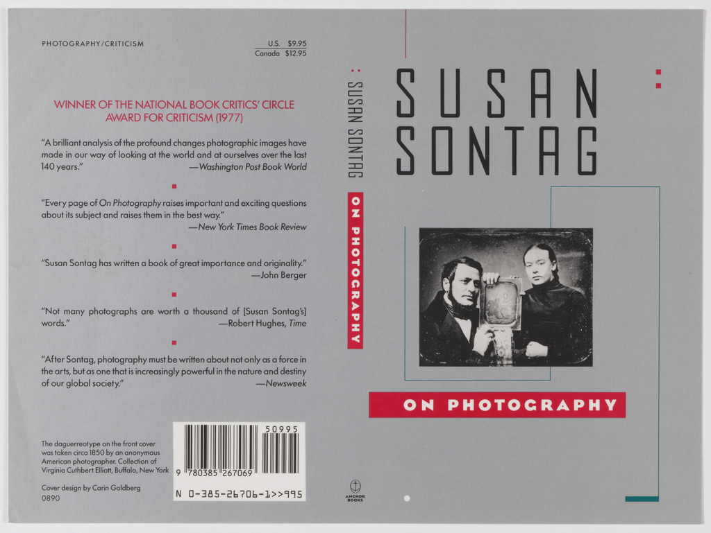 <ref name=CH>{{cite web |url=https://www-6.collection.cooperhewitt.org/objects/18656181/ |title=Book Cover, On Photography |author=Cooper Hewitt, Smithsonian Design Museum |accessdate=20 December 2025 |publisher=Smithsonian Institution}}</ref>
