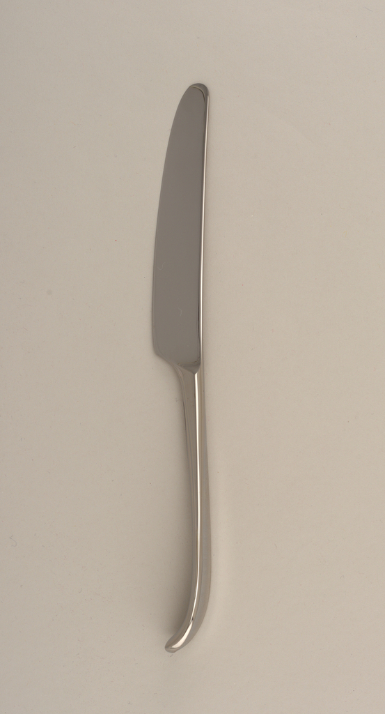 This is a Dinner knife. It was manufactured by Georg Jensen Sølvsmedie and distributed by Royal Copenhagen Porcelain Manufactory. It is dated 1997 and we acquired it in 1998. Its medium is stainless steel. It is a part of the Product Design and Decorative Arts department.