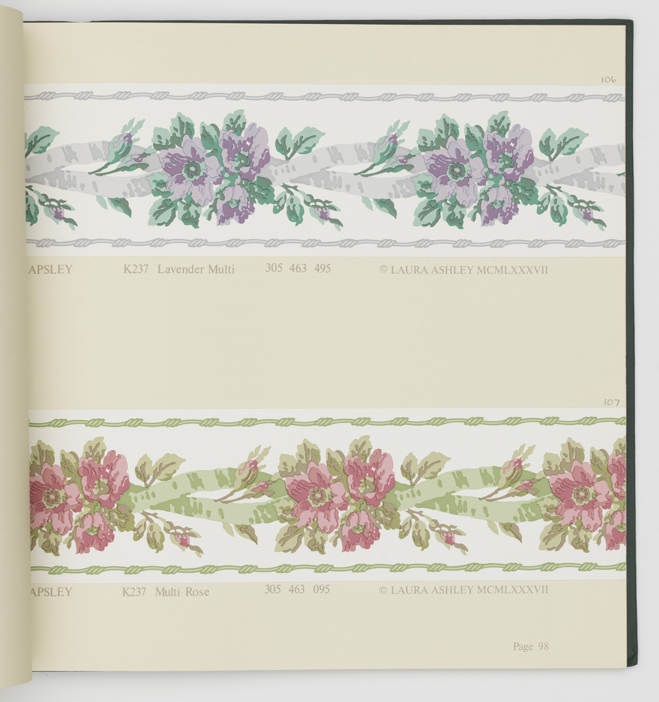 This is a Sample book. It was designed by Laura Ashley. It is dated 1987 and we acquired it in 1997. Its medium is screen-printed on paper. It is a part of the Wallcoverings department.