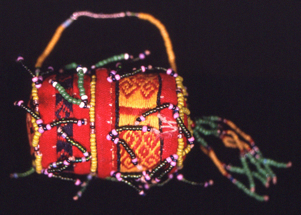 This is a Container. It is dated early 20th century and we acquired it in 1999. Its medium is plant material, cotton, glass beads and its technique is basketry, plain weave, strung beadwork. It is a part of the Textiles department.