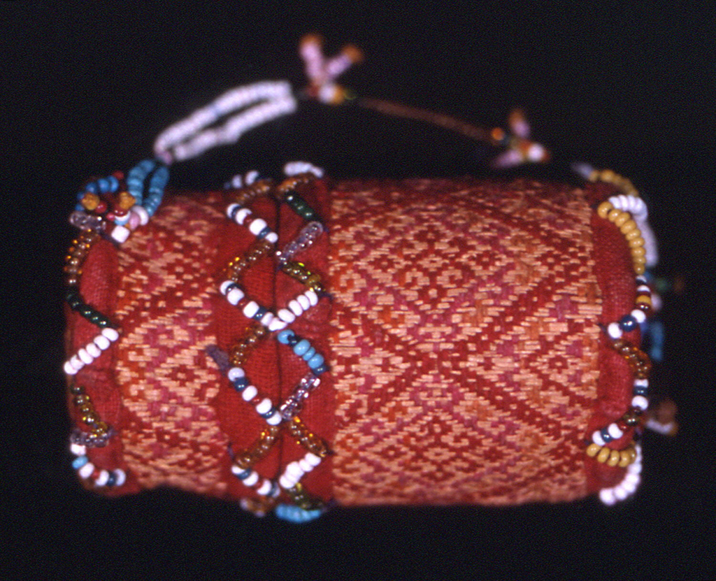 This is a Container. It is dated early 20th century and we acquired it in 1999. Its medium is plant material, cotton, glass beads and its technique is basketry, twill weave, plain weave, supplementary warp patterning, strung beadwork. It is a part of the Textiles department.