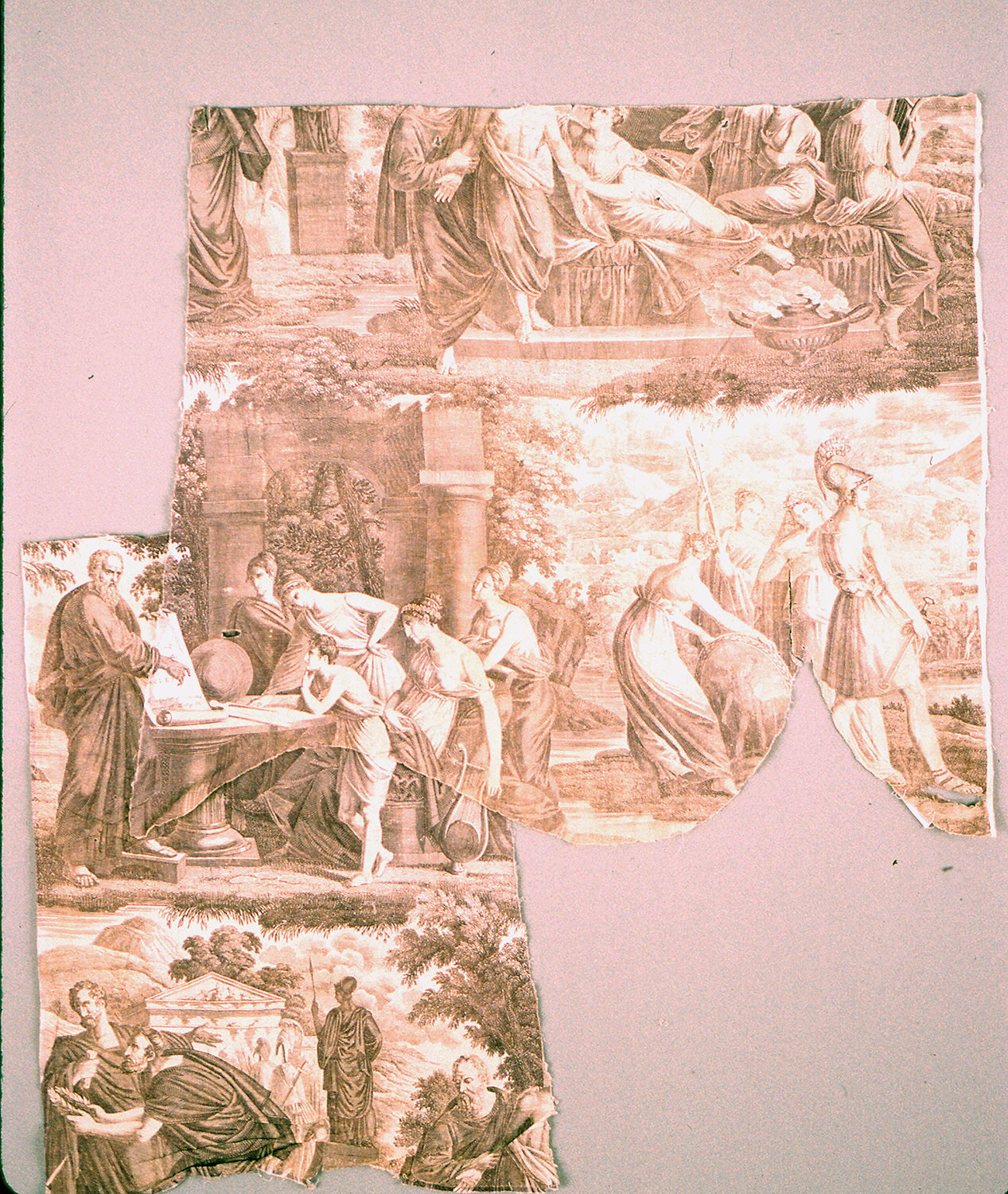 Fragments, Les Lois de Lycurgue; Produced by Favre Petitpierre (France); Engraved by Cholet; France; cotton; A. Warp: 63.5 cm (25 in.) Weft: 71 cm (28 in.). (Edges cut.) B. Warp: 59 cm (23 1/4 in.). Weft: 45 cm (17 1/2 in.) (Edges cut.); Bequest of Elinor Merrell; 1995-50-185-a,b
