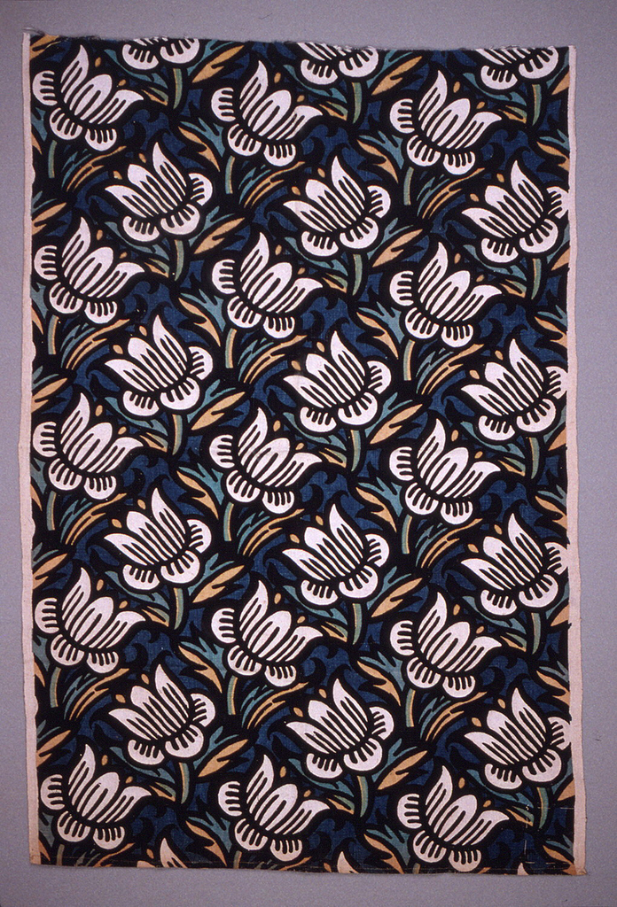 The work of Franz Von Zülow helped to set the style for the Wiener Werkstätte’s Textile Department in its early years, which were characterized by bold, graphic designs. In fact, Von Zülow was primarily known as a graphic artist; his prints were sold in the Wiener Werkstätte shop, and they published a portfolio of his original lithographs in 1912. Early in his career, experimented with a type of printing inspired by Japanese katagami stencil printing, which he patented in 1907 as “paper cut printing.” Unlike traditional stencil printing, the heavy outlines of the design were printed in black, and the cut-out voids hand-colored in brilliant tones. The technique created a cloisonné or stained-glass effect, which is reflected in this textile’s design. Von Zulow’s interest in both folk art and Japanese culture also had a lasting impact on the output of the Workshops.