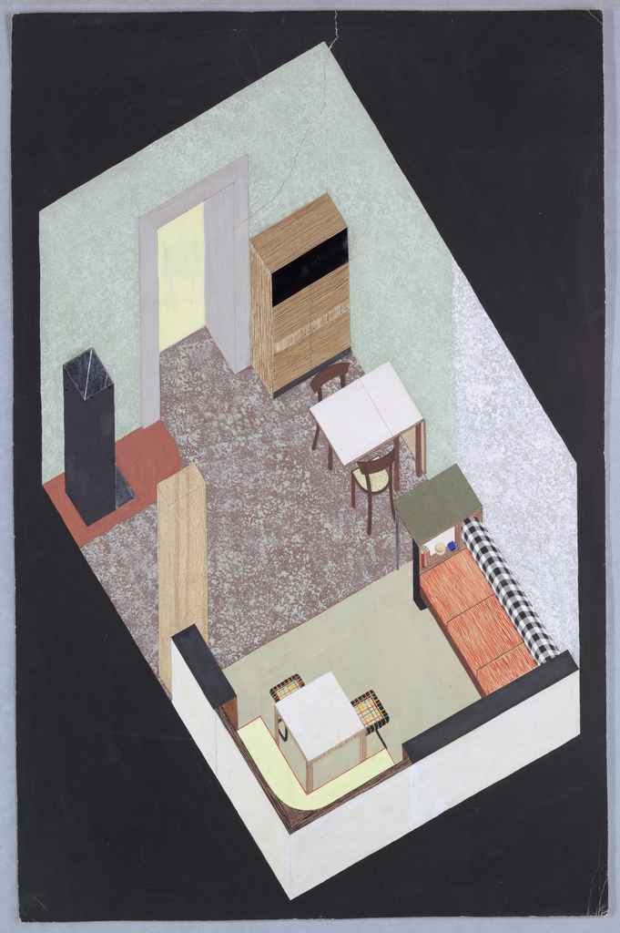 Drawing, Design for a Modern Studio Apartment; Designed by Margarethe Fröhlich (Austrian, 1901–2001); Austria; brush and sponge and gouache, watercolor; pen and brush and black ink; collaged color and printed paper; wood veneer; metal foil inscribed with stylus; graphite on cream textured paper; 54.3 x 35.4 cm (21 3/8 x 13 15/16 in. ); Gift of Margarethe Fröhlich; 1997-109-8