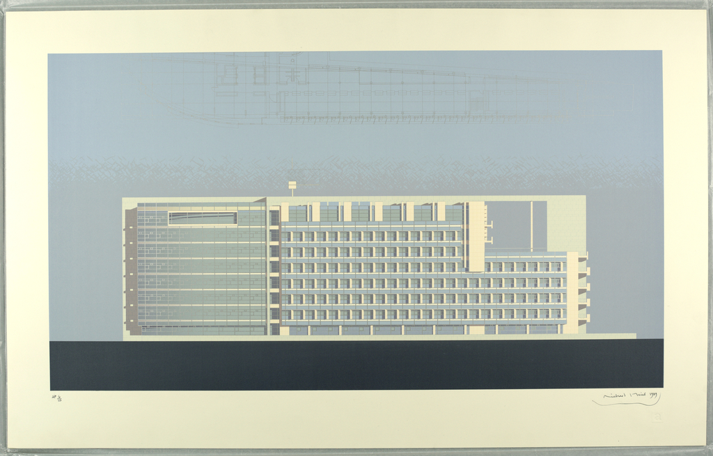Print, Canal +, Paris: Southwest Elevation (noon); Richard Meier (American, b. 1934); Print Maker: John Nichols; screenprint on paper; 76.2 x 121.9 cm (30 x 48 in. ); Gift of Richard Meier; 1999-33-3