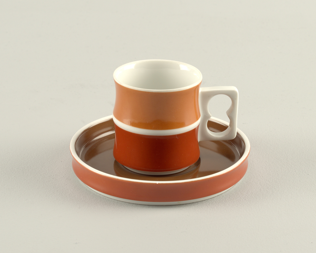 This is a cup and saucer. It was designed by Gerald Gulotta. It is dated designed 1970, marketed 1971–73 and we acquired it in 1999. Its medium is glazed porcelain. It is a part of the Product Design and Decorative Arts department.