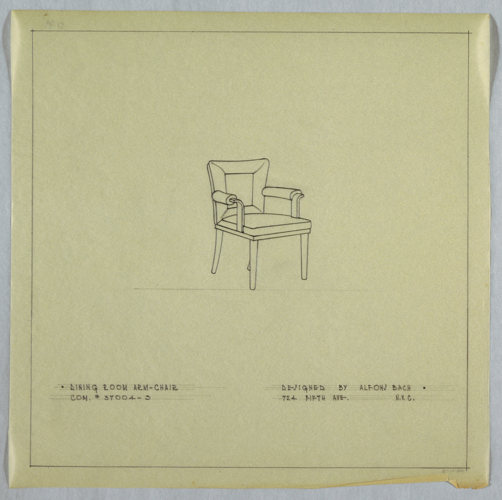 In graphite, lower left: DINING ROOM ARM - CHAIR / COM. #37004-3; DESIGNED BY ALFONS BACH / 724 FIFTH AVE. N.Y.C.