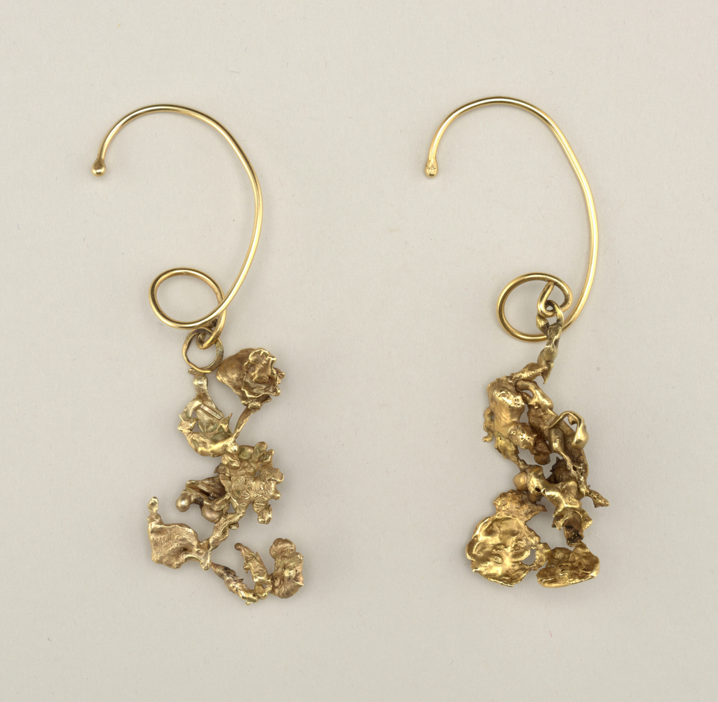 This is a earrings. It was made by Xavier Gonzalez. It is dated possibly ca. 1960 and we acquired it in 2000. Its medium is gold. It is a part of the Product Design and Decorative Arts department.