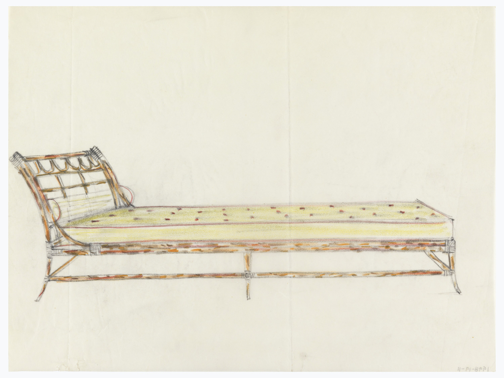 Drawing, Design for Chaise Longue; Designed by Tommi Parzinger (American, b. Germany, 1903–1981); USA; graphite, color pencil on cream tracing paper; 22.4 x 30 cm (8 13/16 x 11 13/16 in.); Gift of Donald Cameron; 1998-19-11