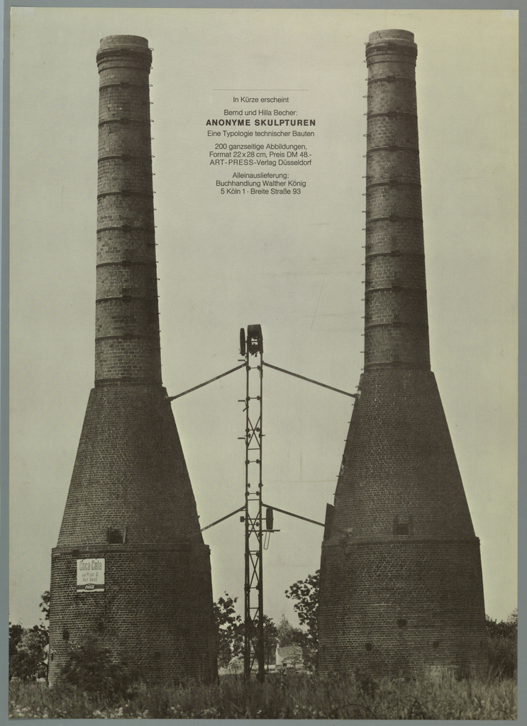 Imprinted in black, top center: "In Kürze erscheint/ Bernd und Hilla Becher: ANONYME SKULTUREN/ Eine Typologie technischen Bauten/ 200 ganzseitige Abbildungen. Format 22 x 28 cm, Preis DM 48.-/ ART-PRESS-Verlag Düsseldorf/ Alleinauslieferung:/ Buchhandlung Walther König/ 5 Köln/ Breite Straße 93"