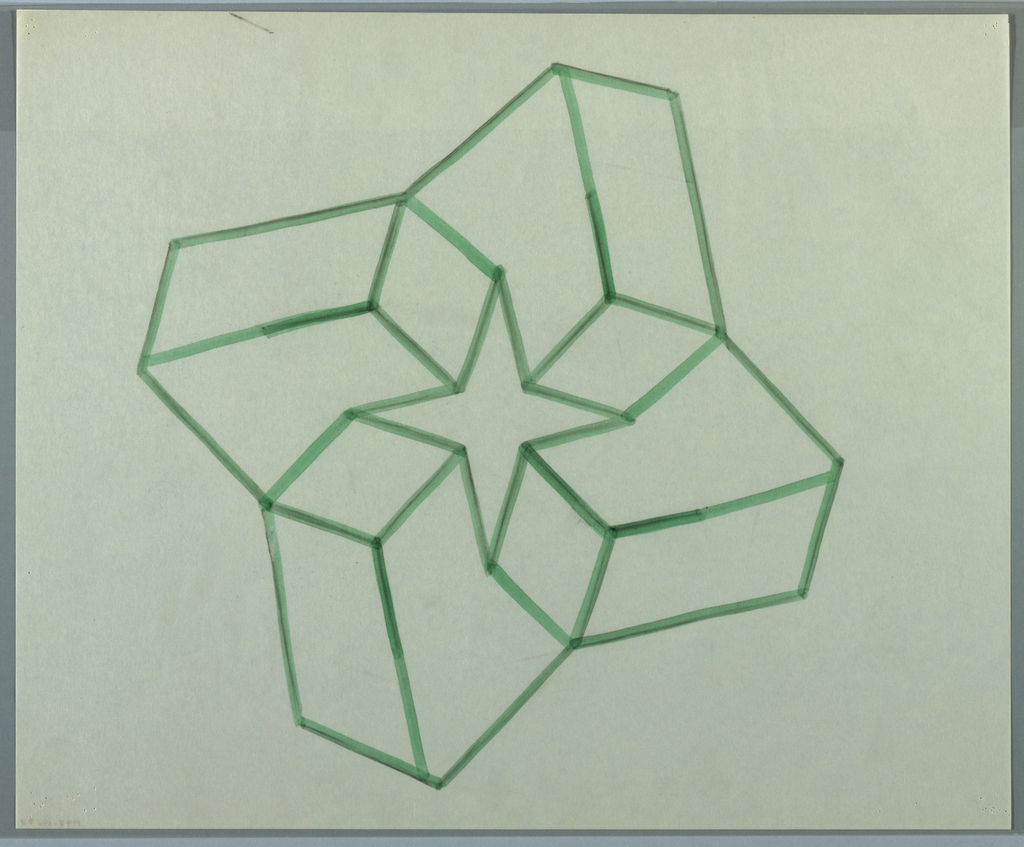 This is a Drawing. It was designed by Dan Friedman. It is dated ca. 1975 and we acquired it in 1997. Its medium is graphite, green marker on white tracing paper. It is a part of the Drawings, Prints, and Graphic Design department.