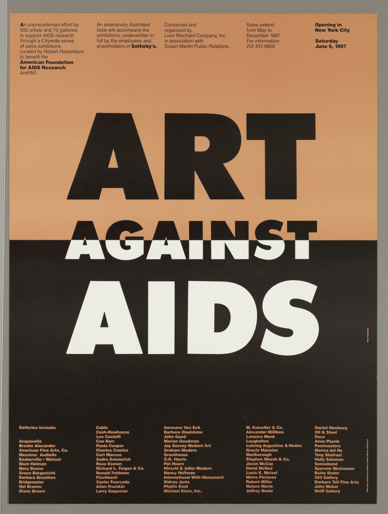 Poster, Art Against Aids; Designed by Dan Friedman (American, 1945–1995); Printed by Water Street Press; USA; lithograph on paper; 60.9 x 45.7 cm (24 x 18 in.); Gift of Ken Friedman; 1997-19-232