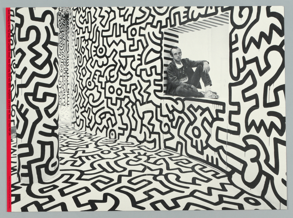 Imprinted in black on red along left side: Keith Haring in the Pop Shop, 292 Lafayette Street, New York City, New York 10012. Telephone 212-219-2784 Telex: 277633 POP UR Imprinted in black lower left: Photo by Tseng Kwong Chi, print by Ivan Dalla Tana Verso: Imprinted in black at lower left along edge: Photography concept and art direction by Tseng Kwong Chi, Drawings by Keith Haring, Unachrome [TM] by Duggal