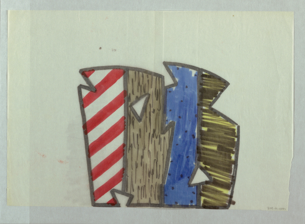 This is a Drawing. It was designed by Dan Friedman. It is dated ca. 1985 and we acquired it in 1997. Its medium is black and color marking pens, silver paint, graphite on white tracing paper. It is a part of the Drawings, Prints, and Graphic Design department.