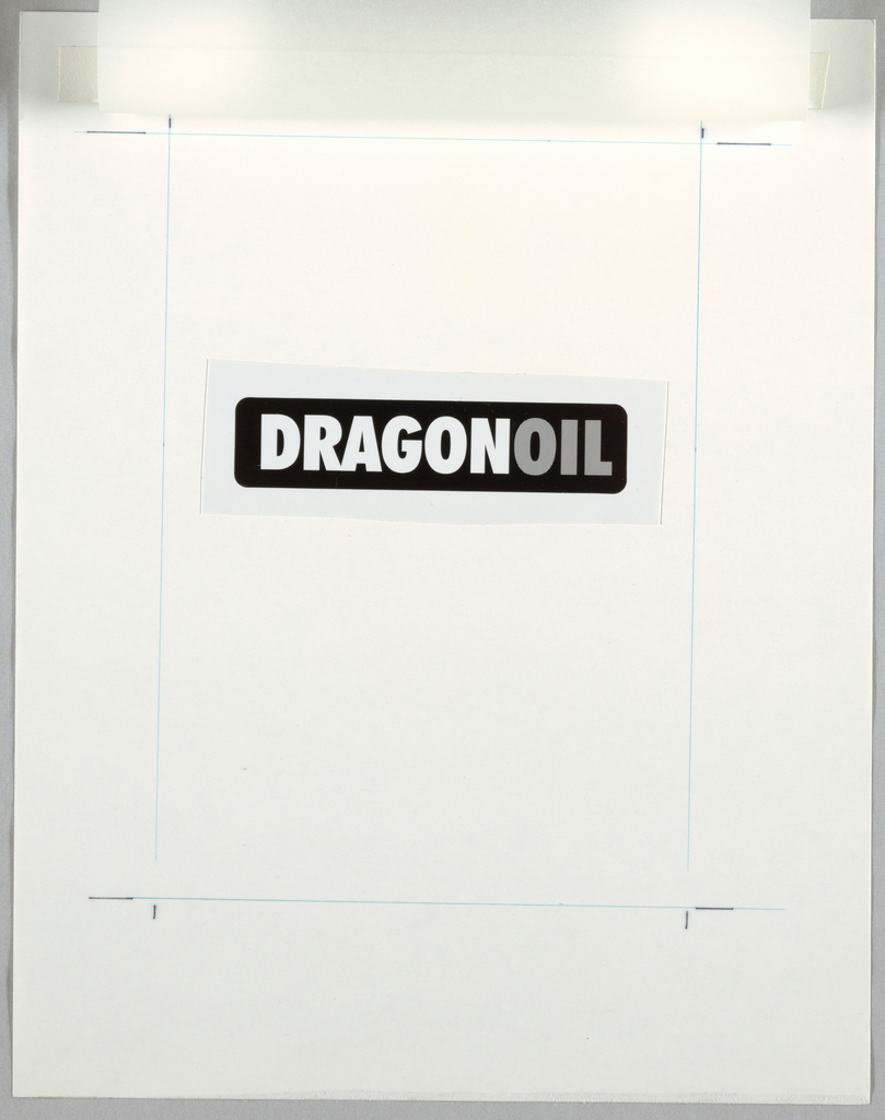 Drawing, DragonOil (Black and White Mock-up with Overlay); Designed by Dan Friedman (American, 1945–1995); photographic plastic film, blue and black ink, white adhesive paper tape, white tracing paper mounted to white wove paper; 35.6 x 27.9 cm (14 x 11 in. ); Gift of Ken Friedman; 1997-19-385