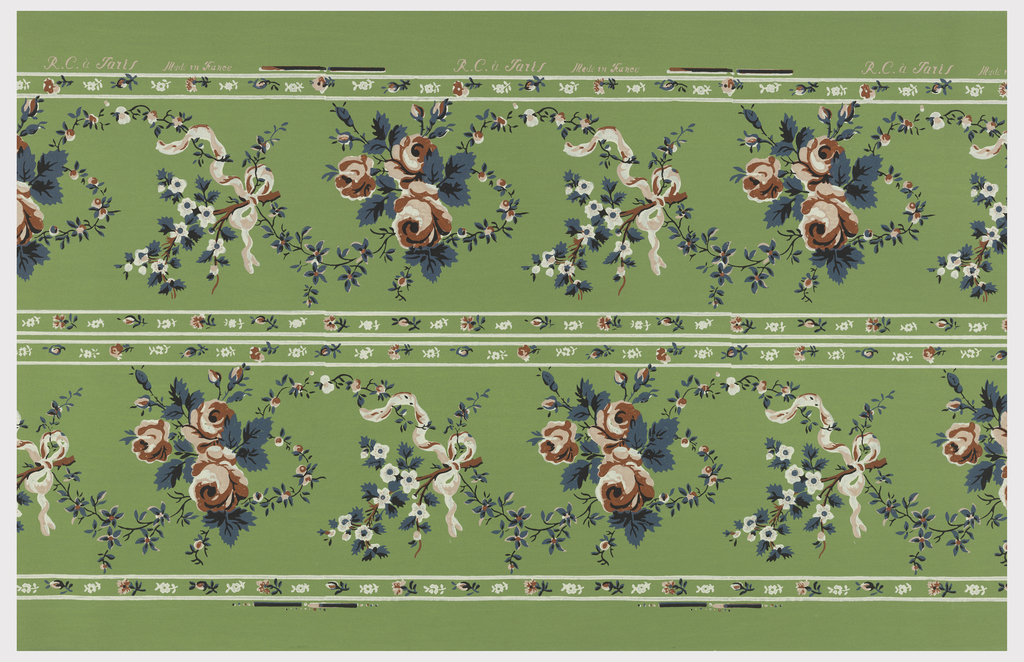 This is a Border. It was distributed by Nancy McClelland. It is dated 1920–50 and we acquired it in 1998. Its medium is block-printed. It is a part of the Wallcoverings department.