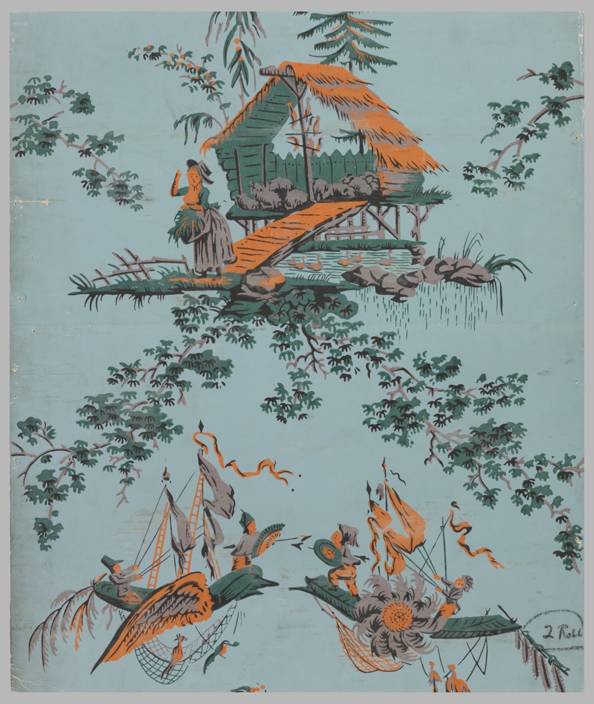 Each figure in this lower scene seems to wear a different costume, but the one worn by the spear bearer on the left ship seems reminiscent of Chinese costume. His presence would have made this paper appealing for any fan of chinoiserie, or “Chinese style” design. Meanwhile the upper scene appeals to an entirely different 18th-century obsession, the obsession with idyllic rustic scenes. Both chinoiserie and the fad for images of country life spoke to an 18th-century obsession for escapist fantasies. Marie Antoinette famously had a little fake village built for her near the palace of Petit Trianon, where she could pretend to be a rural milkmaid living a life far from the confines of the court. Idyllic cottages could be found all over France in elite private gardens. Sometimes accompanying them would be tearooms in the shape of pagodas or Chinese tents where nobles could retire and imagine themselves living an exotic lifestyle free from the constrictions of high-class society. Chinoiserie and rural-style interiors served an elite class obsessed with personal indulgence and new fantastical sites for private leisure activities.