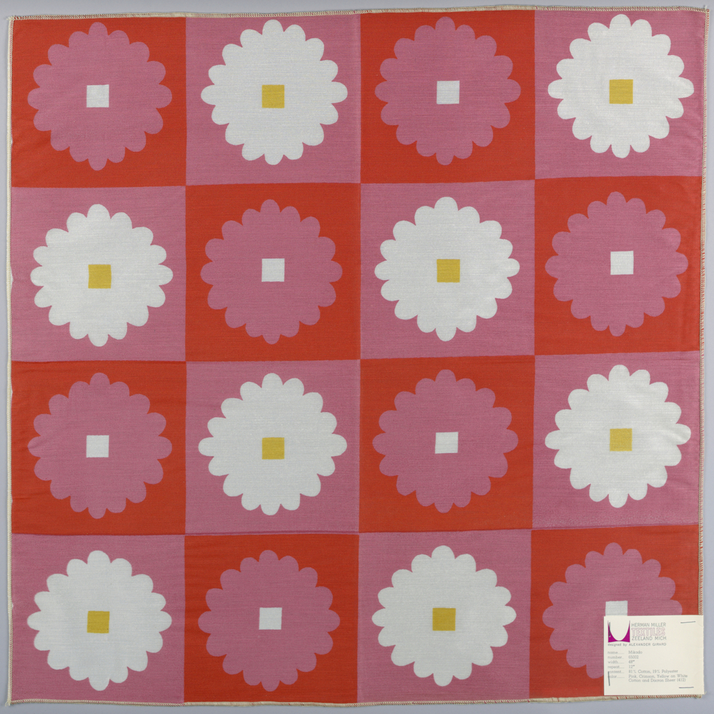 This is a Sample. It was designed by Alexander Hayden Girard and manufactured by American Art Textile Printing Company, Inc. and produced by Herman Miller Textiles. It is dated 1954 and we acquired it in 1969. Its medium is 81% cotton, 19% polyester and its technique is screen printed on plain weave. It is a part of the Textiles department.