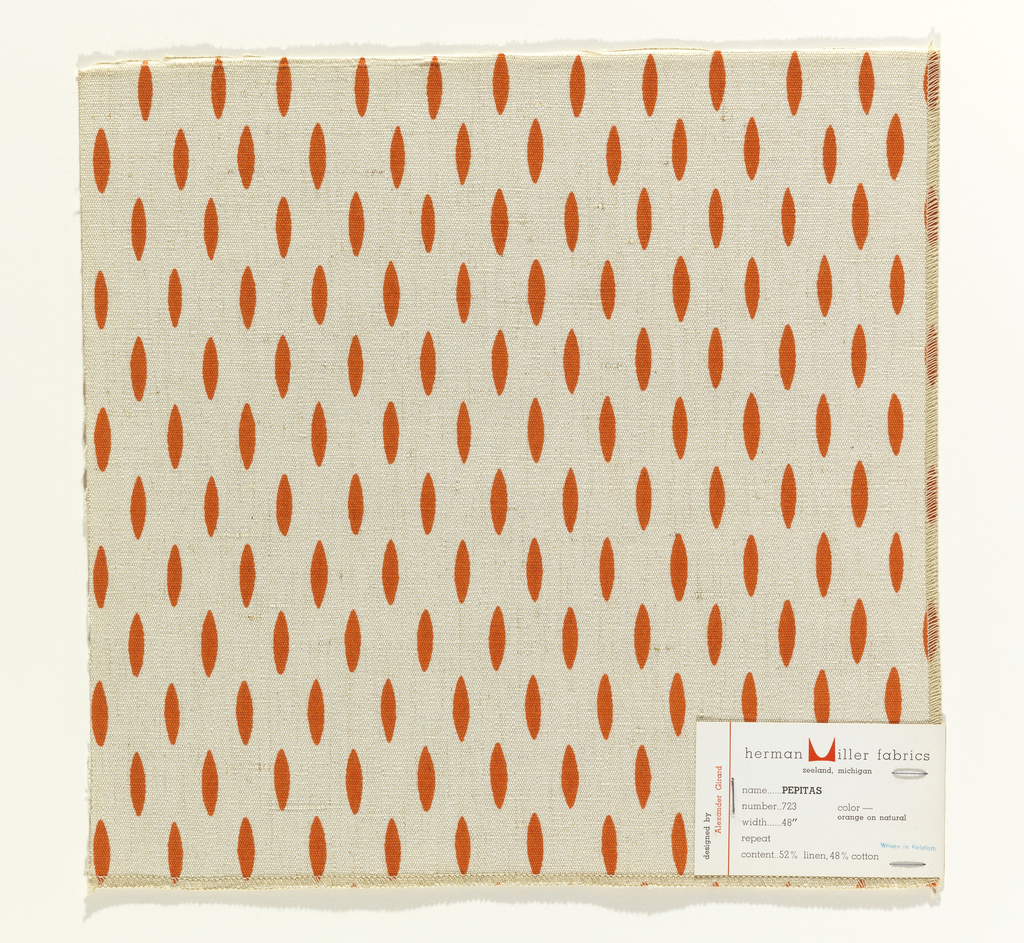 This is a Sample. It was designed by Alexander Hayden Girard and manufactured by American Art Textile Printing Company, Inc. and produced by Herman Miller Textiles. It is dated 1952 and we acquired it in 1969. Its medium is 52% linen, 48% cotton and its technique is screen printed on plain weave. It is a part of the Textiles department.