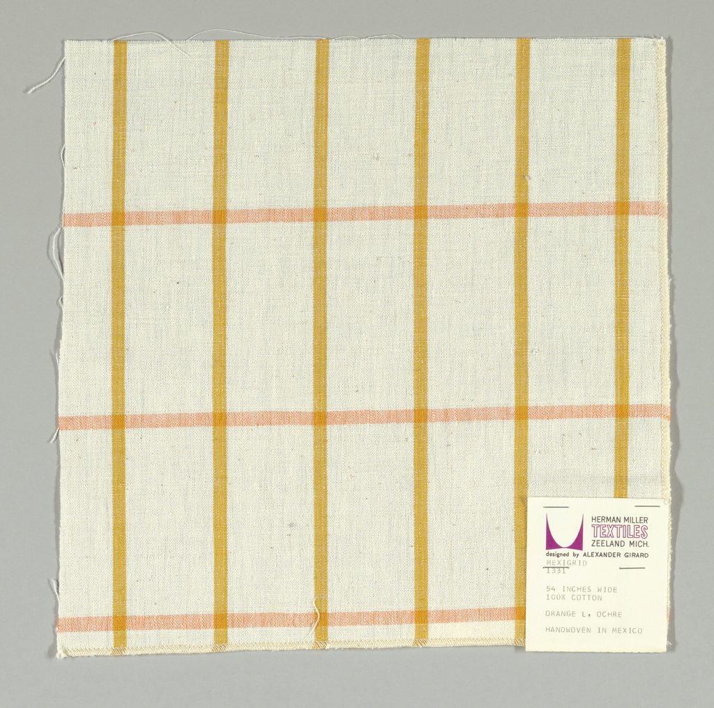 This is a Sample. It was designed by Alexander Hayden Girard and produced by Herman Miller Furniture Company. It is dated 1966 and we acquired it in 1969. Its medium is cotton and its technique is plain weave. It is a part of the Textiles department.