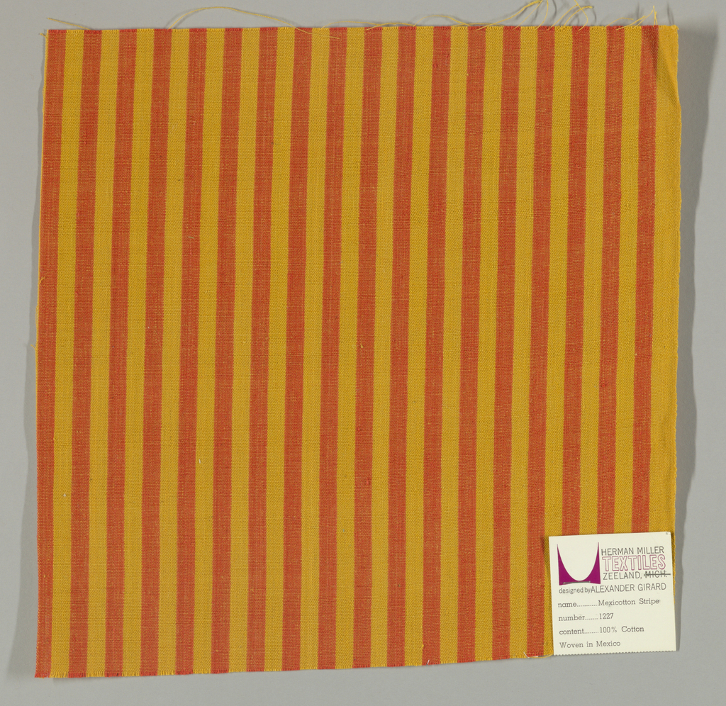 This is a Sample. It was designed by Alexander Hayden Girard and produced by Herman Miller Furniture Company. It is dated 1961 and we acquired it in 1969. Its medium is cotton and its technique is plain weave. It is a part of the Textiles department.