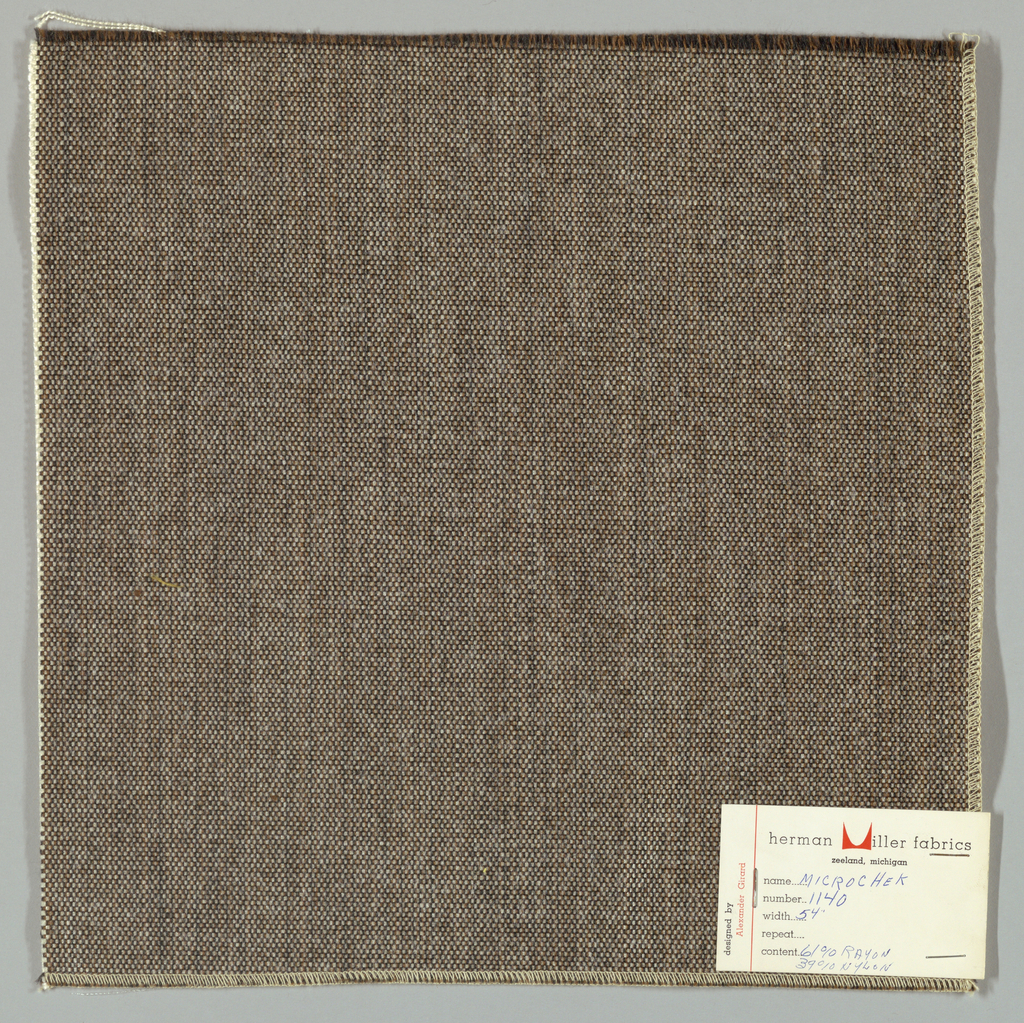 This is a Sample. It was designed by Alexander Hayden Girard and produced by Herman Miller Furniture Company. It is dated 1960 and we acquired it in 1969. Its medium is rayon (61%) and nylon (39%) and its technique is plain weave. It is a part of the Textiles department.