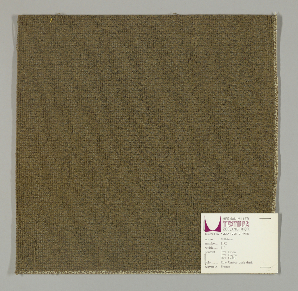 Sample, Milfrieze; Designed by Alexander Hayden Girard (American, 1907–1993); Produced by Herman Miller Furniture Company (United States); USA; linen (37%), rayon (37%), and cotton (26%); Warp x Weft: 29.8 x 30.5 cm (11 3/4 x 12 in.); Gift of Alexander H. Girard; 1969-165-715
